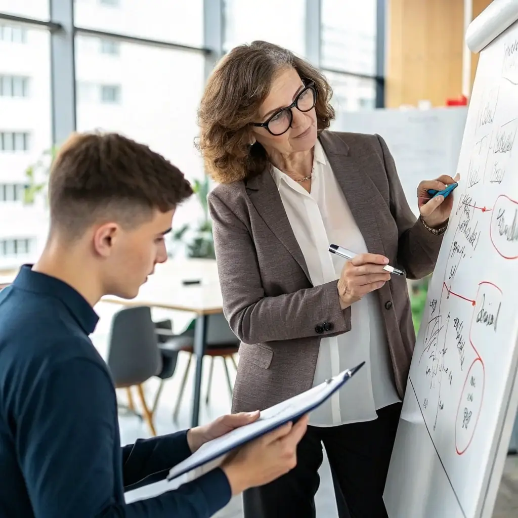A professional coach guiding a client through leadership development exercises in a modern office setting, emphasizing strategic thinking and confidence-building.