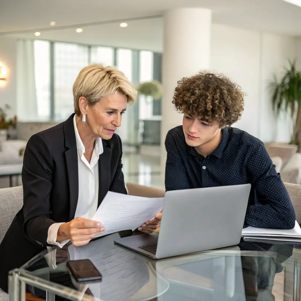 An entrepreneur discussing business plans with a coach in a collaborative workspace, focusing on business planning and marketing strategies.